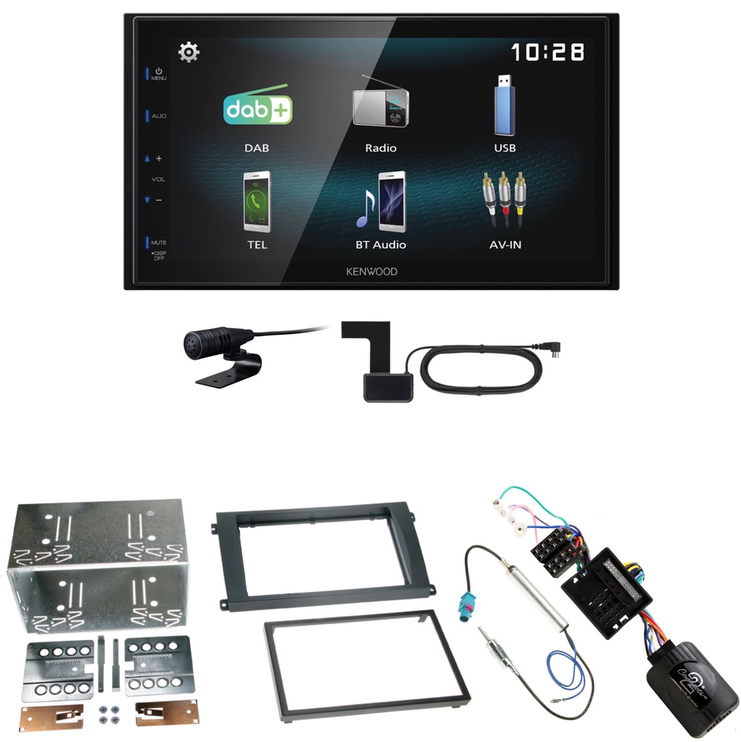 Komplett Einbauset bestehend aus: Kenwood DMX-125DAB inkl. DAB Scheibenklebeantenne, Radioblende, CAN-Bus-/Lenkradfernbedienungsadapter und Antennenadapter mit Phantomseinspeisung.