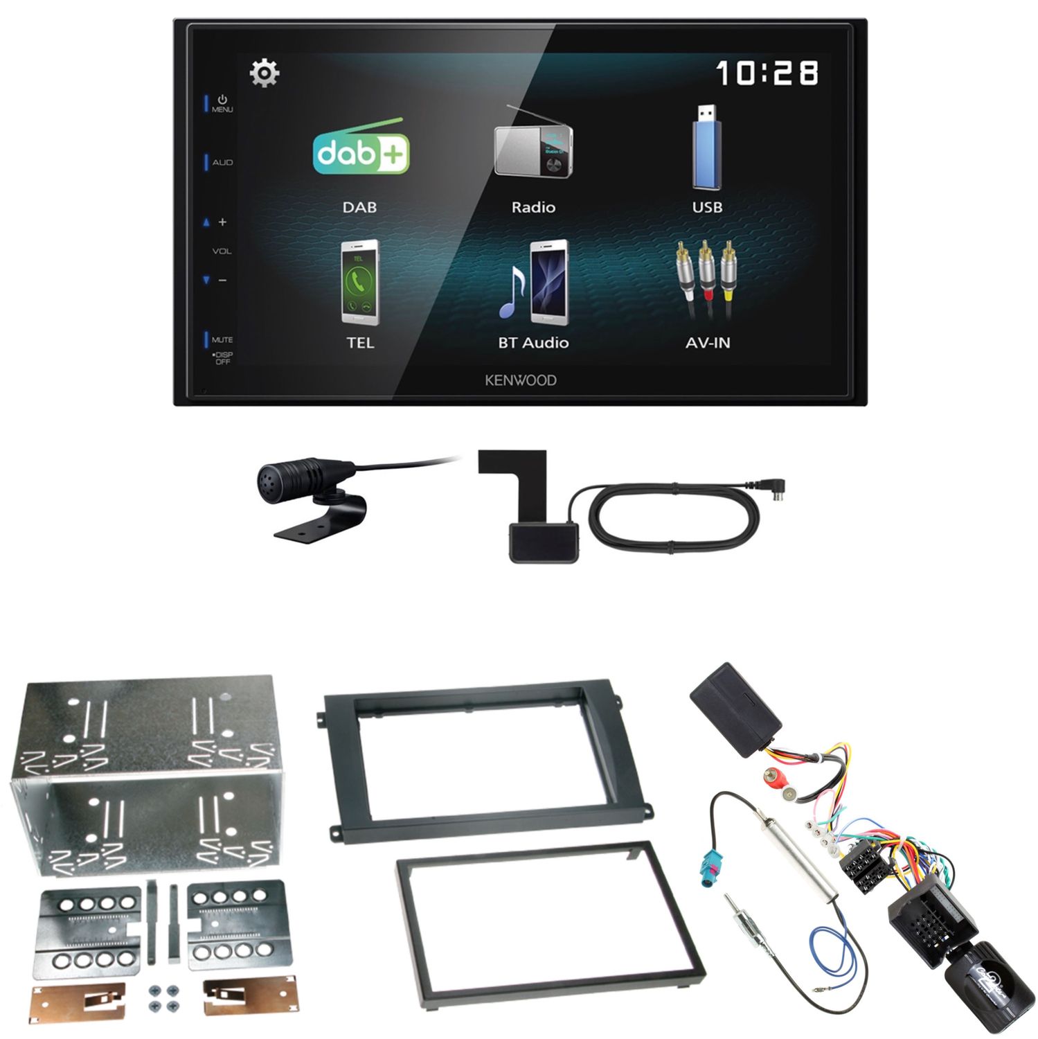 Komplett Einbauset bestehend aus: Kenwood DMX-125DAB inkl. DAB Scheibenklebeantenne, Radioblende, CAN-Bus-/Lenkradfernbedienungsadapter, Adapter für das BOSE Soundsystem und Antennenadapter mit Phantomseinspeisung.
