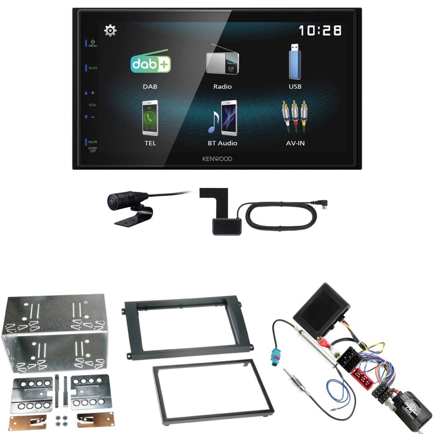 Komplett Einbauset bestehend aus: Kenwood DMX-125DAB inkl. DAB Scheibenklebeantenne, Radioblende, CAN-Bus-/Lenkradfernbedienungsadapter, Adapter für BOSE Soundsystem und Antennenadapter mit Phantomseinspeisung.
