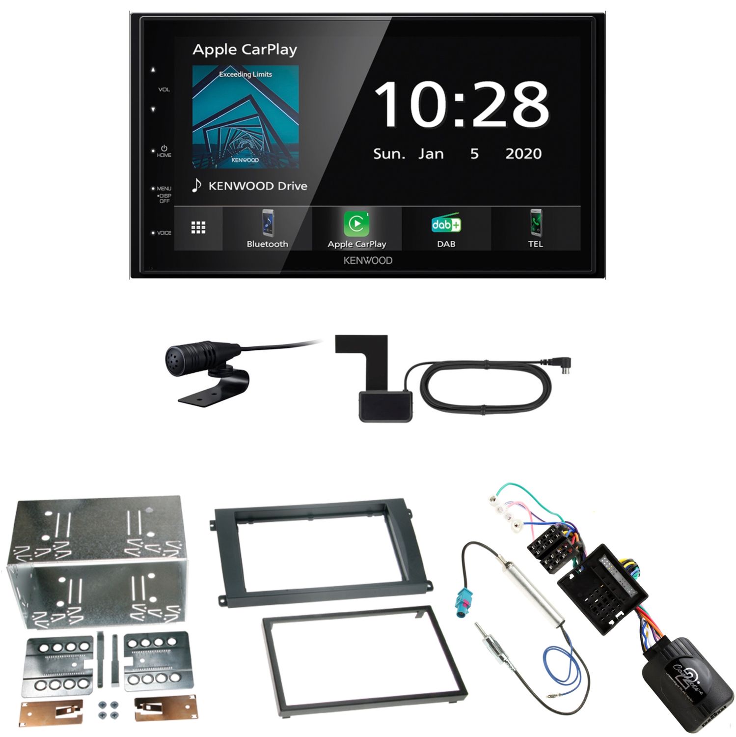 Komplett Einbauset bestehend aus: Kenwood DMX-5020DABS inkl. DAB Scheibenklebeantenne, Radioblende, CAN-Bus-/Lenkradfernbedienungsadapter und Antennenadapter mit Phantomseinspeisung.
