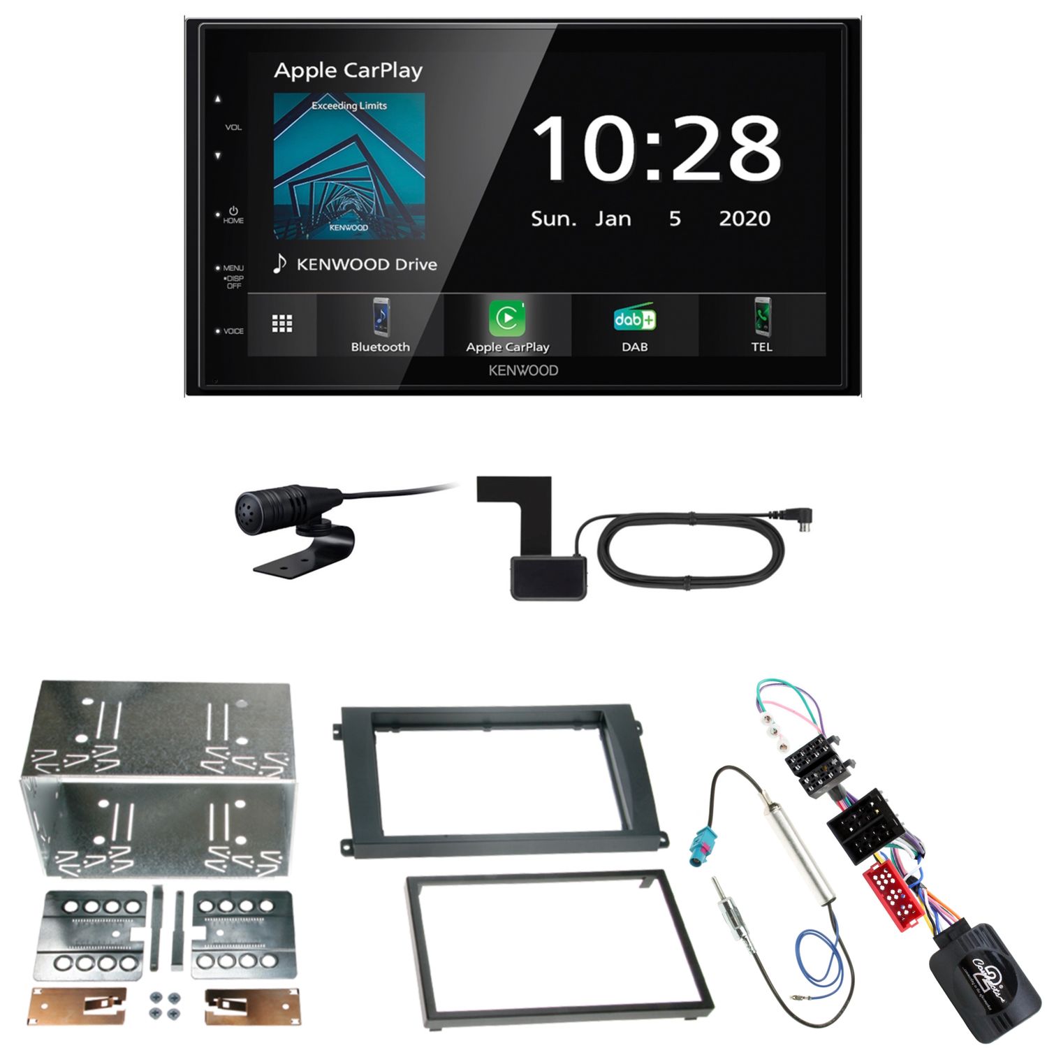 Komplett Einbauset bestehend aus: Kenwood DMX-5020DABS inkl. DAB Scheibenklebeantenne, Radioblende, CAN-Bus-/Lenkradfernbedienungsadapter und Antennenadapter mit Phantomseinspeisung.