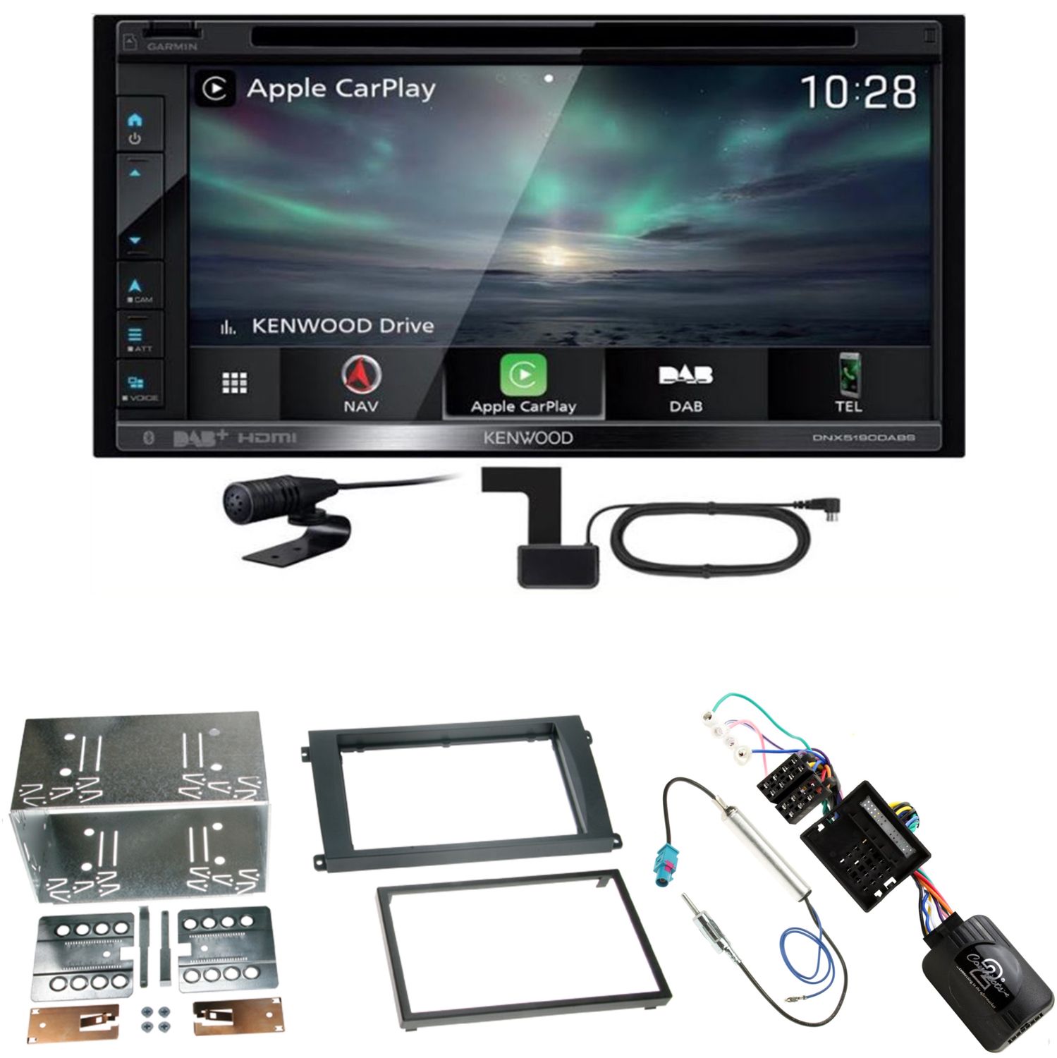 Komplett Einbauset bestehend aus: Kenwood DNX-5190DABS inkl. DAB Scheibenklebeantenne, Radioblende, CAN-Bus-/Lenkradfernbedienungsadapter und Antennenadapter mit Phantomseinspeisung.