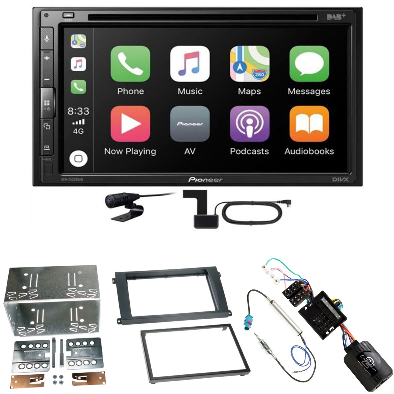 Komplett Einbauset bestehend aus: Pioneer AVH-Z5200DAB inkl. DAB Scheibenklebeantenne, Radioblende, CAN-Bus-/Lenkradfernbedienungsadapter und Antennenadapter mit Phantomseinspeisung.