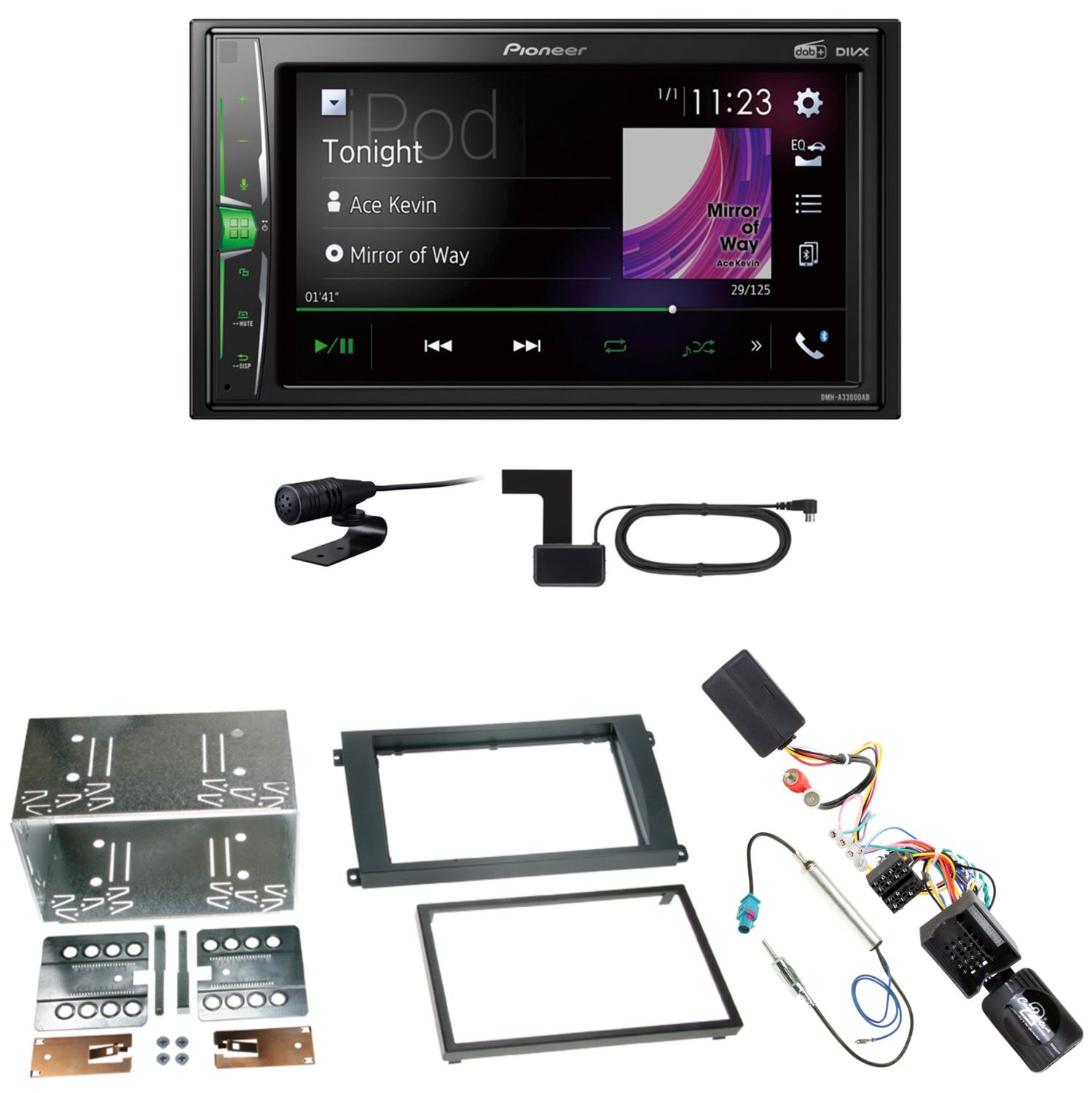 Komplett Einbauset bestehend aus: Pioneer DMH-A3300DAB inkl. DAB Scheibenklebeantenne, Radioblende, CAN-Bus-/Lenkradfernbedienungsadapter, Adapter für das BOSE Soundsystem und Antennenadapter mit Phantomseinspeisung.