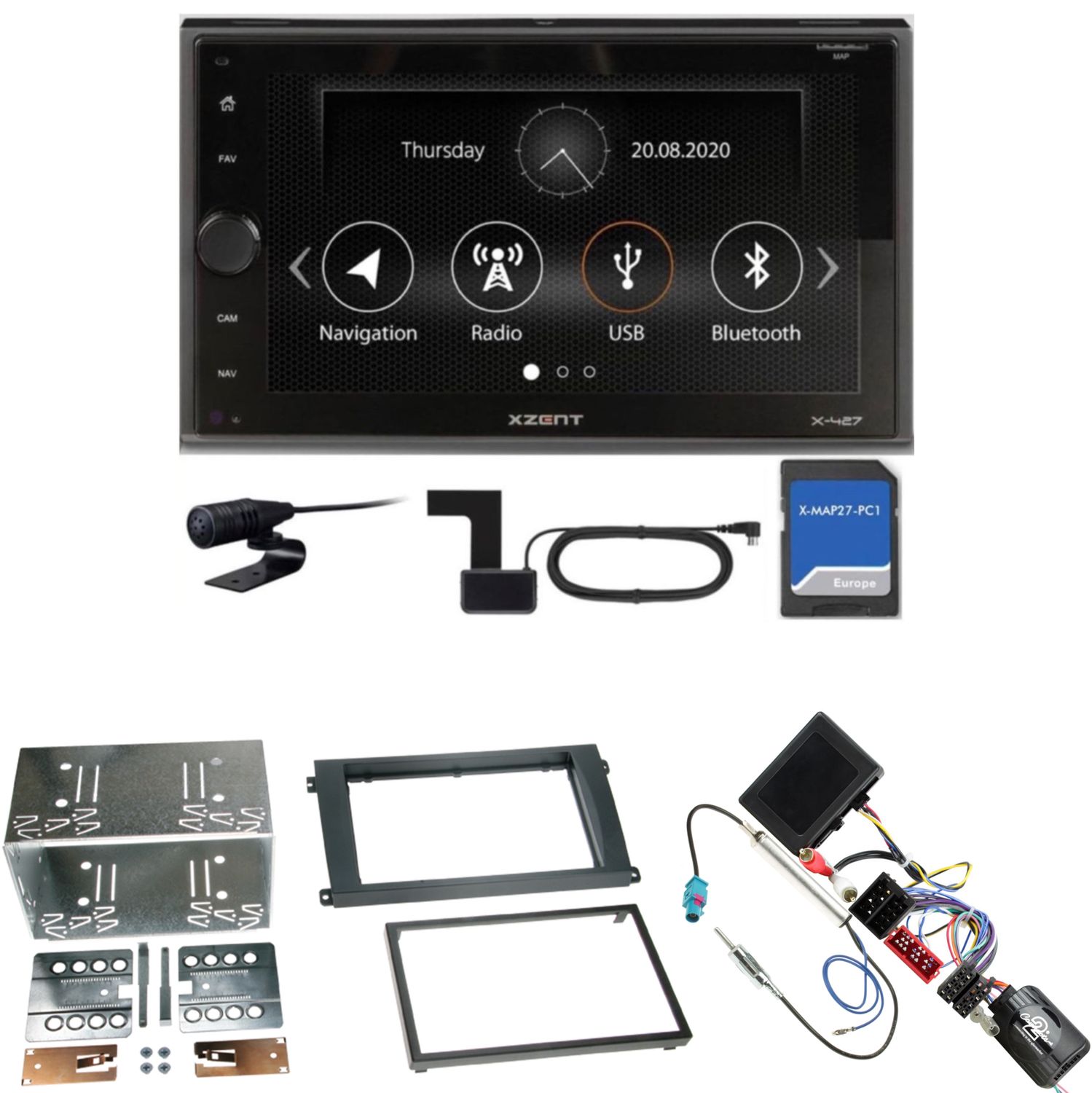 Komplett Einbauset bestehend aus: XZENT X-427 + X-MAP27-PC1 inkl. DAB Scheibenklebeantenne, Radioblende, CAN-Bus-/Lenkradfernbedienungsadapter, Adapter für BOSE Soundsystem und Antennenadapter mit Phantomseinspeisung.